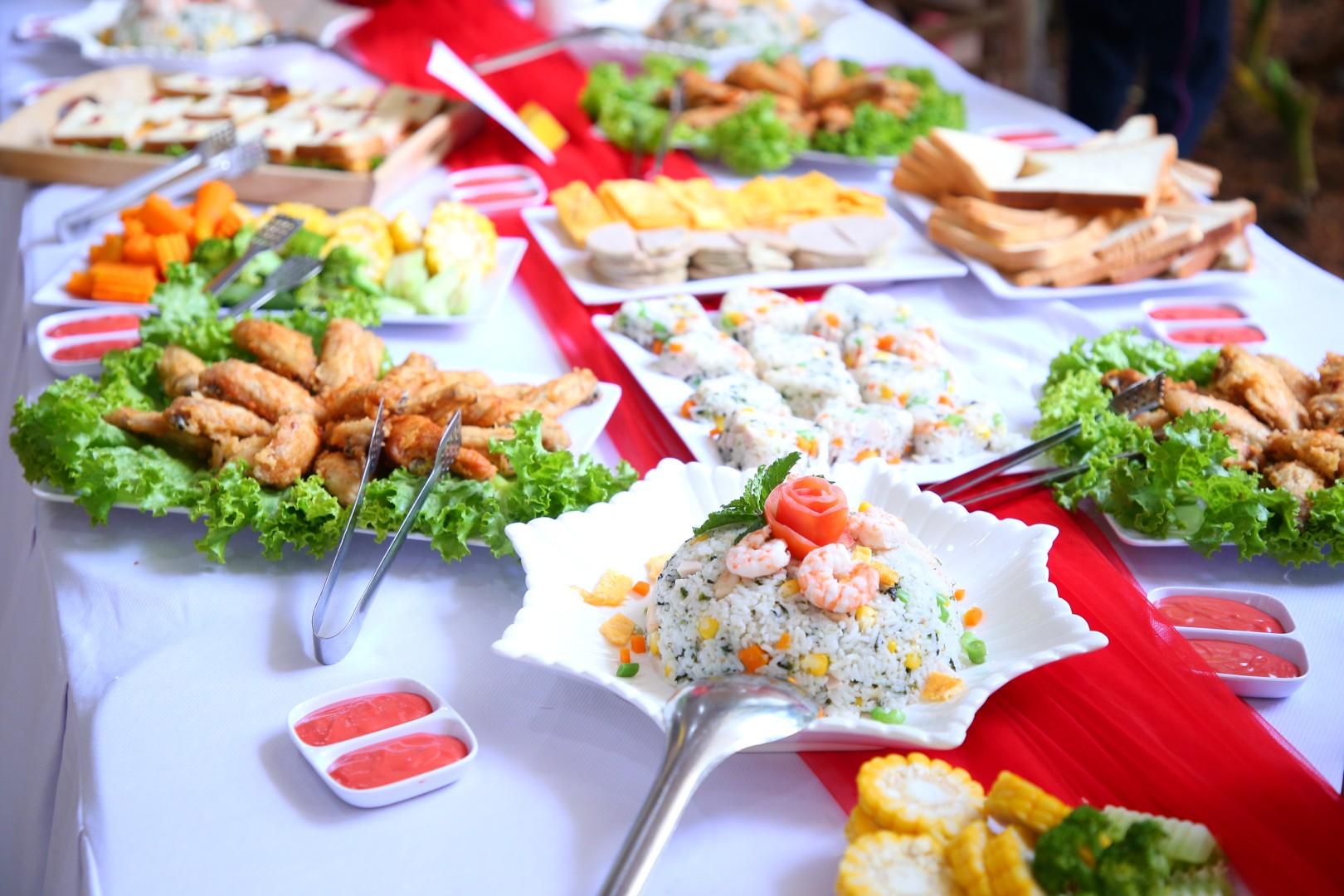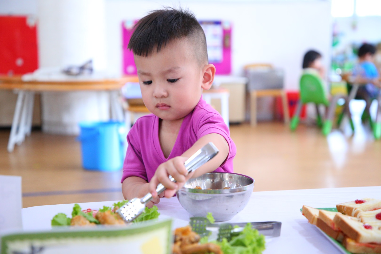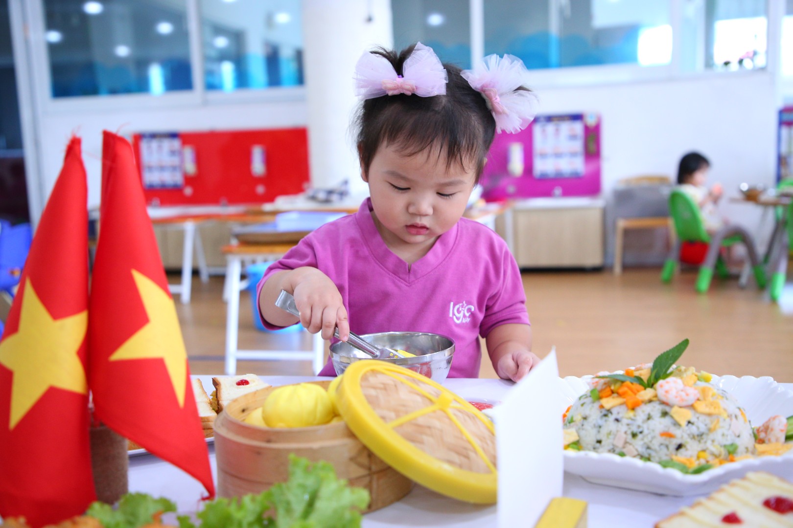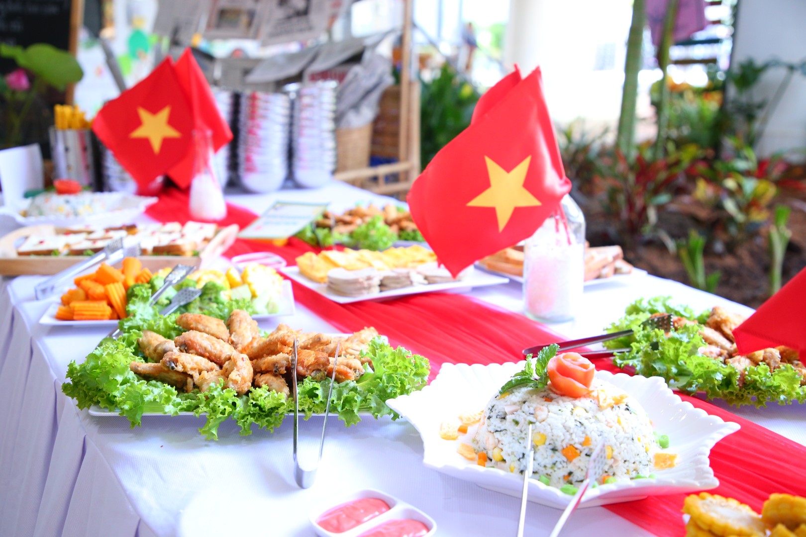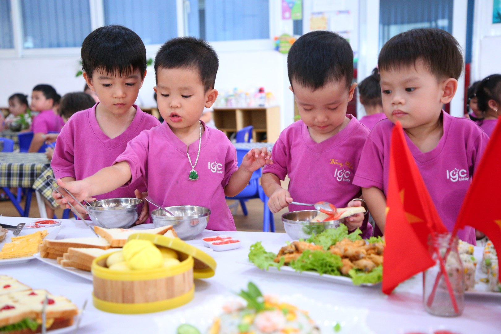 Buffet là hình thức ăn uống có nguồn gốc từ phương Tây, trẻ hoàn toàn tự phục vụ bữa ăn của mình và tùy thích lựa chọn món ăn, nước uống giúp bữa ăn phong phú, hấp dẫn hơn. Với thực đơn đa dạng các món ăn của các nước trên thế giới như: Nhật, Hàn, Thái Lan, Việt Nam hoặc từ các vùng miền khác nhau... giúp trẻ hứng thú trong việc lựa chọn các món ăn và thưởng thức ẩm thực. Hơn nữa, hình thức buffet còn giúp trẻ giao lưu, trò chuyện cùng bạn và giáo dục trẻ thói quen xếp hàng chờ đến lượt, tự phục vụ, tự lựa chọn giúp trẻ thêm mạnh dạn, tự tin giao tiếp, ứng xử tạo tiền đề cho sự phát triển của trẻ một cách toàn diện. Trẻ sẽ học cách thưởng thức các món ăn một cách từ tốn và thanh lịch. Sự kết hợp món ăn theo chủ đề và sự sắp xếp môi trường là cơ hội để trẻ cảm nhận được hết giá trị của từng bữa ăn.